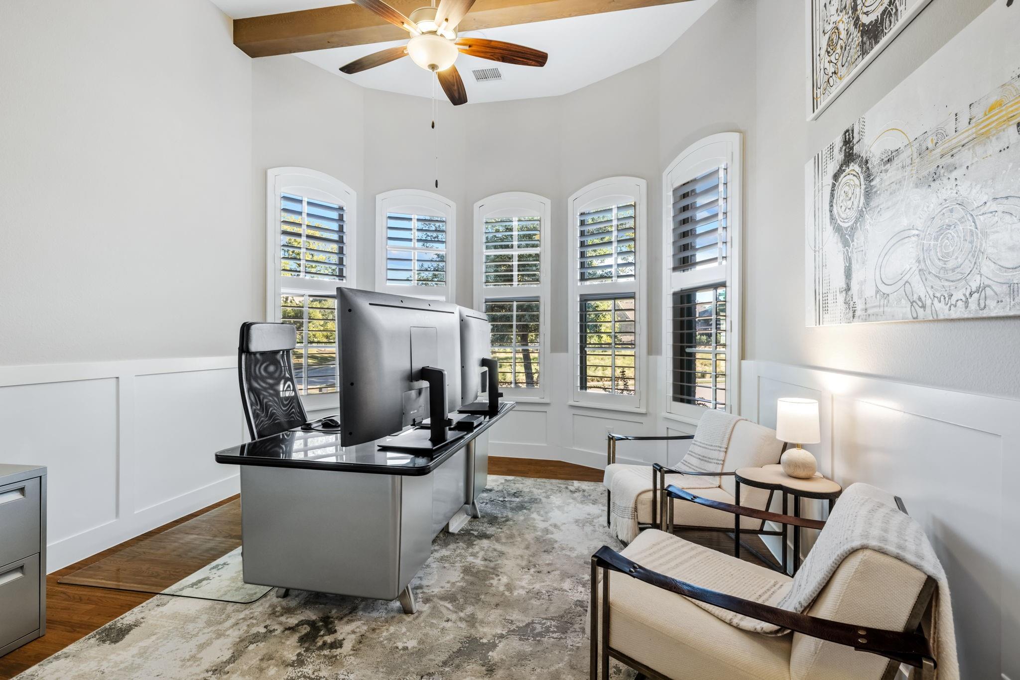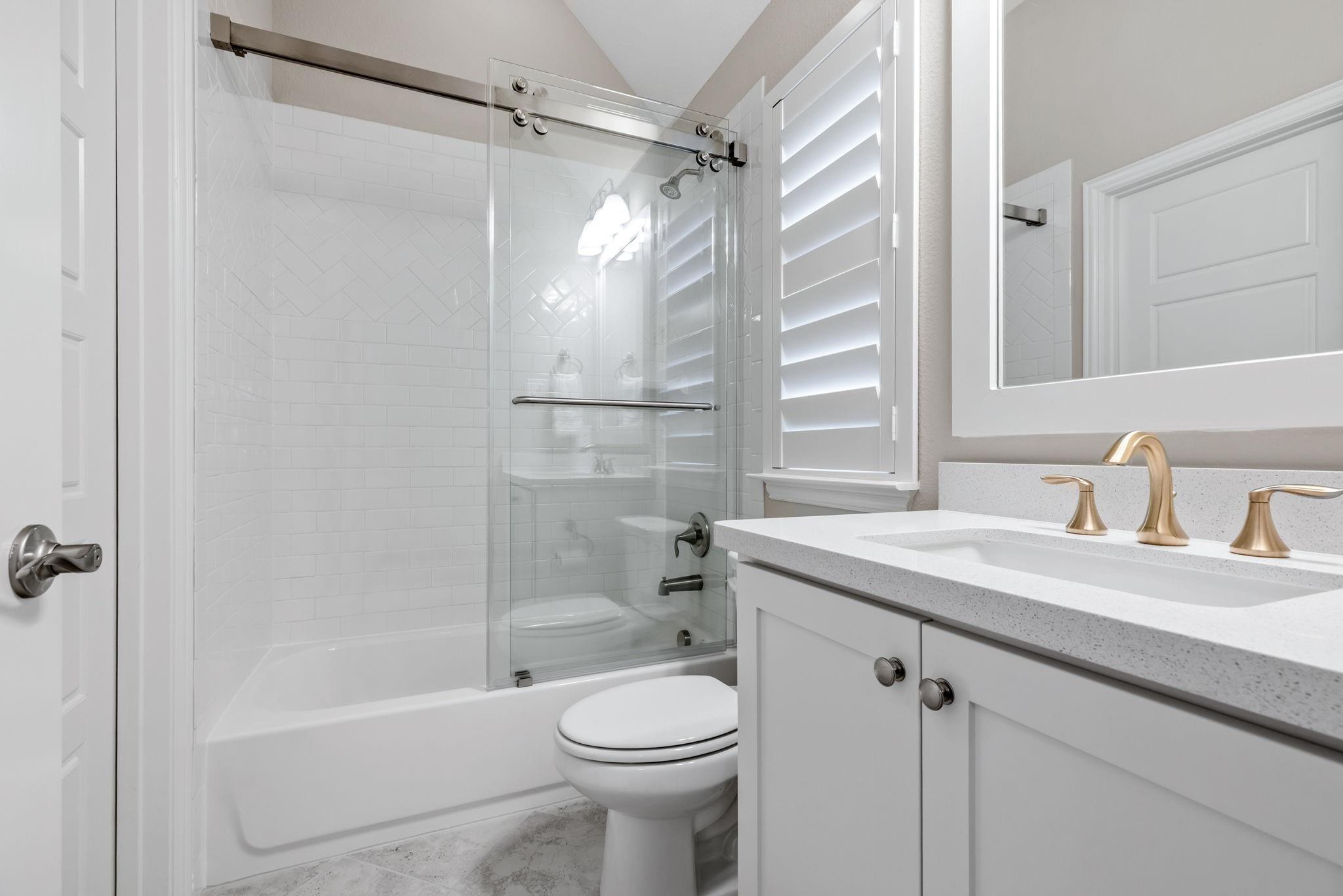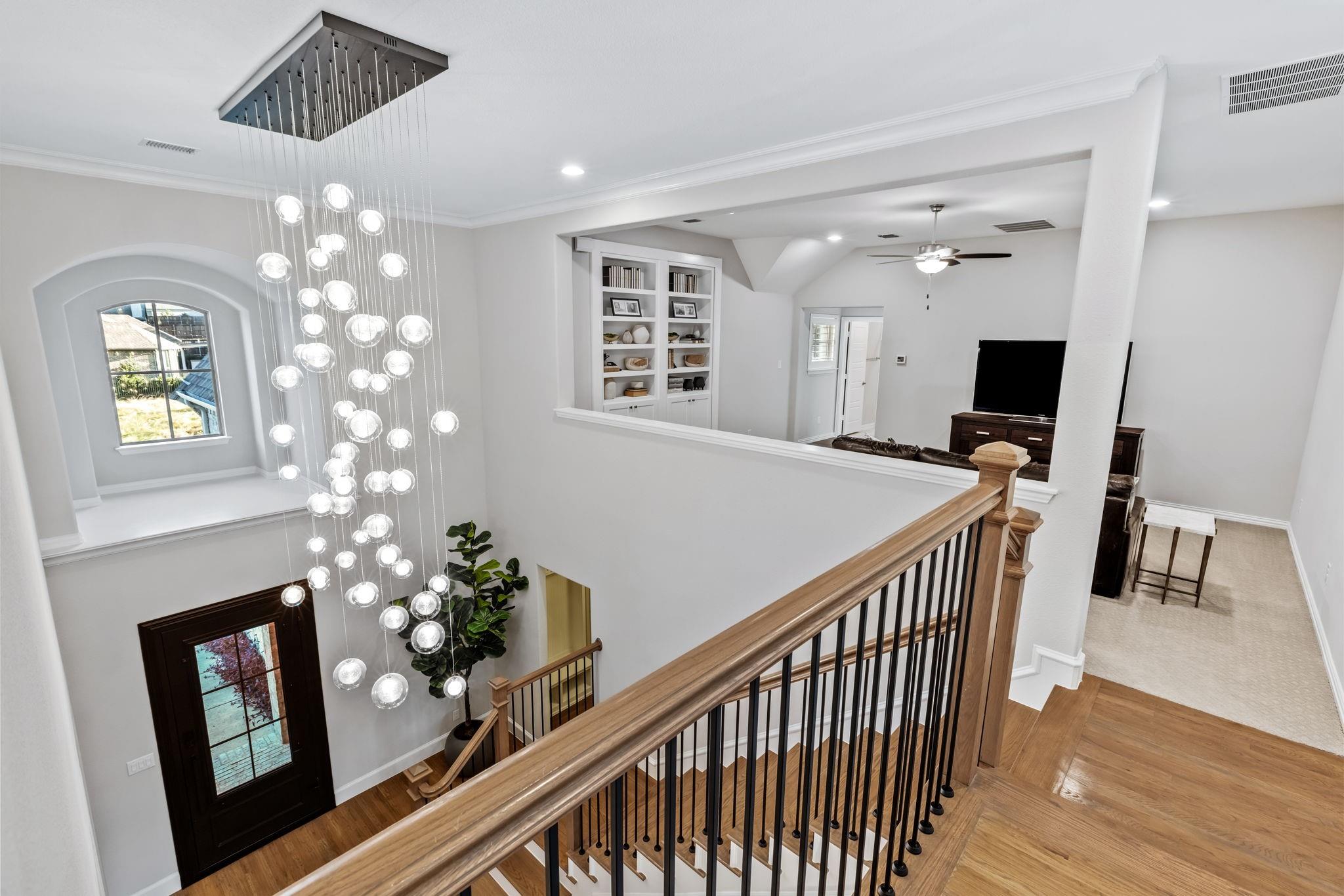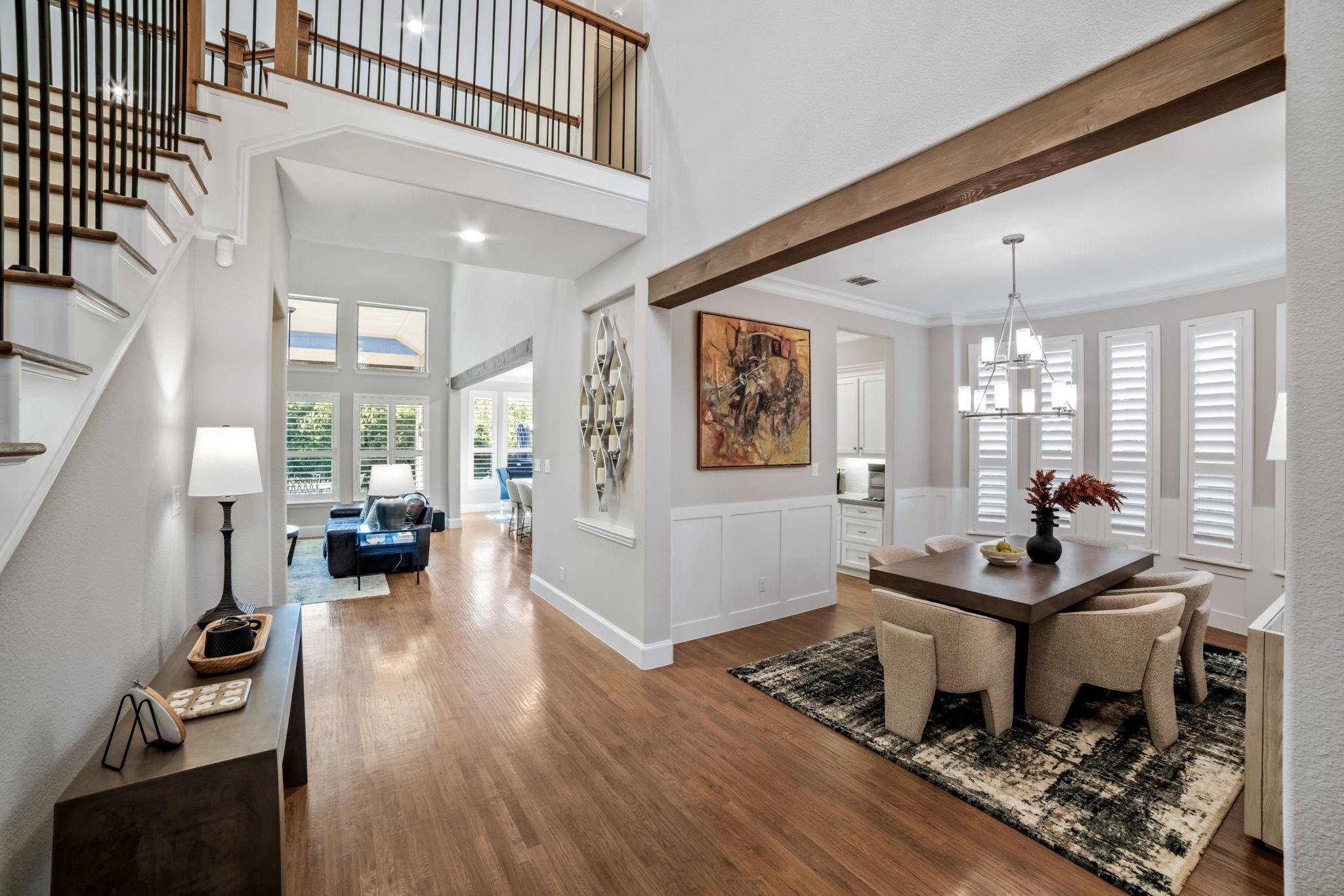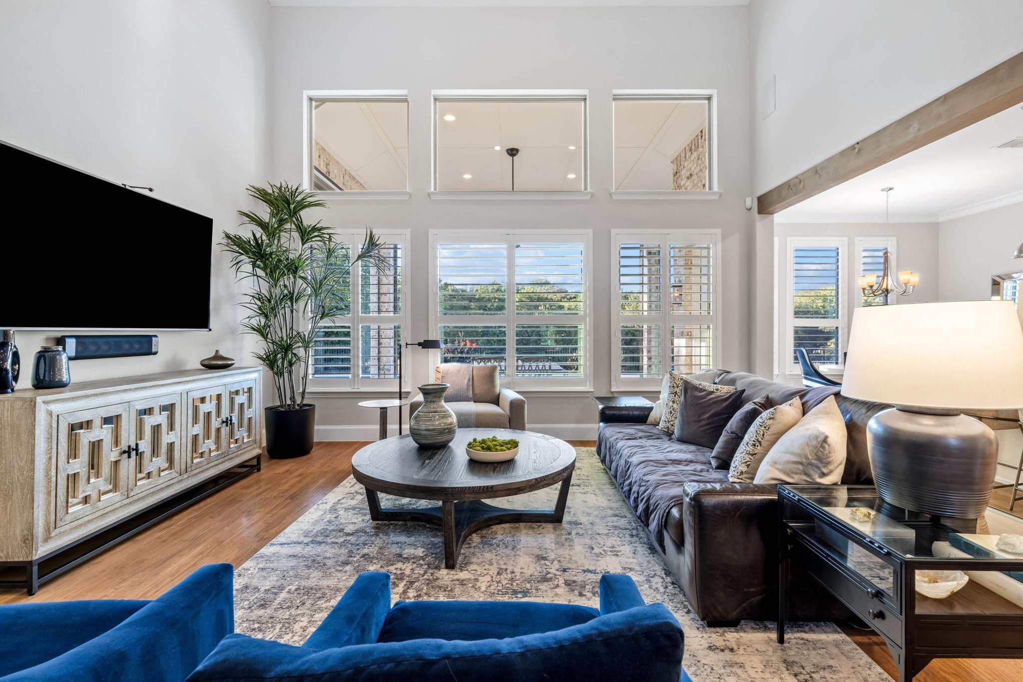 RARE OPPORTUNITY – LUXURIOUS, MOVE-IN-READY HOME WITH SPARKLING POOL AND SPA! Situated on an interior lot in the highly sought-after Whitley Place community and zoned to Walnut Grove High School, this exceptional 5-bedroom residence seamlessly combines elegant design with comfortable everyday living. Stunning hardwood floors flow throughout the main living areas, complemented by custom accent beams, designer lighting, and a striking floor-to-ceiling stone fireplace that anchors the space with warmth and style. The entertainer’s delight kitchen is beautifully appointed with a built-in refrigerator and premium finishes, all open to the main living areas for effortless hosting. A breathtaking wall of windows in the living room, kitchen, and primary bedroom frames gorgeous greenbelt views, filling the home with natural light and creating a serene connection to the outdoors. The tranquil primary suite offers a true retreat, highlighted by a spa-inspired bathroom with an oversized shower designed for relaxation. Step outside to the private backyard oasis, perfect for entertaining or unwinding in the glistening pool and spa while enjoying the peaceful greenbelt setting. The thoughtfully designed layout continues with a spacious game room featuring built-in shelving, including a hidden entry to the expansive media room cleverly concealed within the shelving—perfect for movie nights and entertaining. Four of the five bedrooms feature private en suite baths, offering comfort and privacy for family and guests alike. The home also boasts a spacious utility room conveniently located by the large mudroom area, providing both functionality and style for everyday living. No MUD or PID.